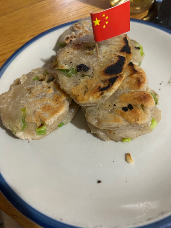 Scallion pancakes are easy enough to make. You make some simple dough, roll it into balls, flatten them, brush one side with oil, salt, and scallions. Then coil it up, and flatten it again. It is important that you keep the scallions on ONE side of the pancake when you first put them on prior to the coiling.