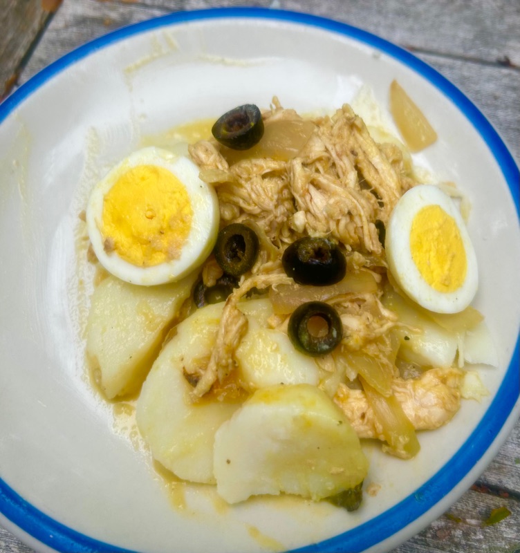 4. Serve over rice with boiled potato slices, garnished with egg slices and olives.