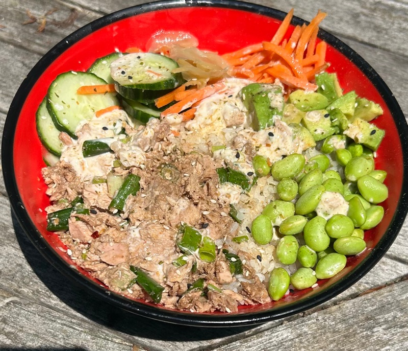 - In a serving bowl, layer rice, then arrange tuna, cucumber, edamame, carrots, and avocado.