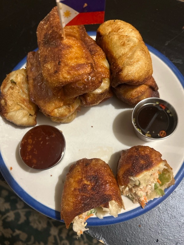 Description: Crispy spring rolls filled with meat and vegetables, served with a sweet chili or vinegar dipping sauce.