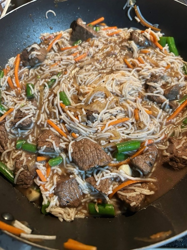 - Heat oil in a large wok or pan over medium-high heat. Add the sliced beef and stir-fry until browned, about 5 minutes. Remove and set aside.